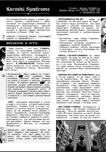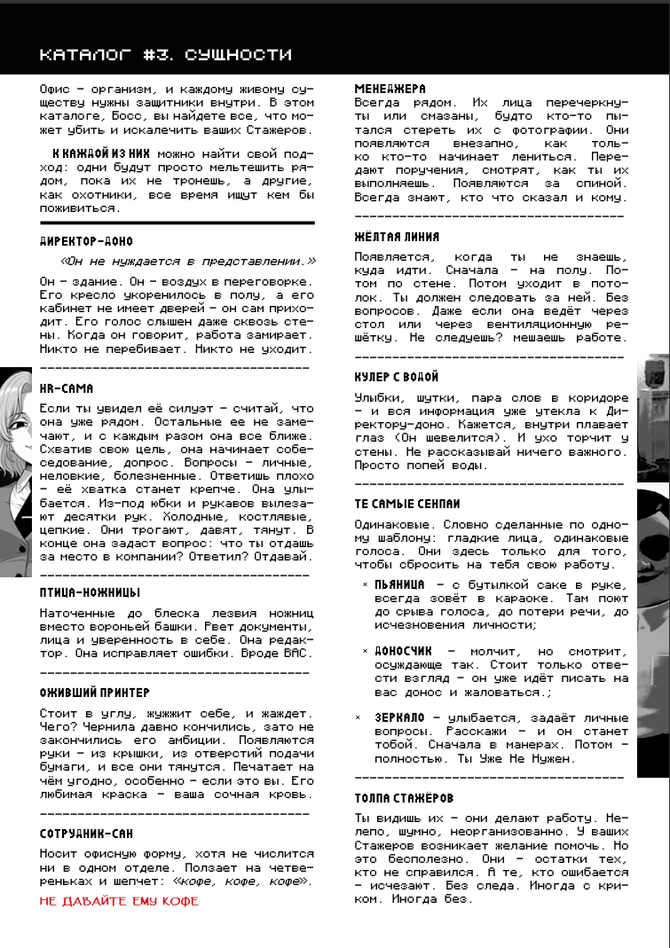 Это универсальный модуль в жанре офисного хоррора, совместимый с любой системой. Он акцентирует внимание на лиминальных пространствах, офисной культуре и её изъянах. Действие про исходит в офисном здании неизвестной компании в Японии, 1980 год.
