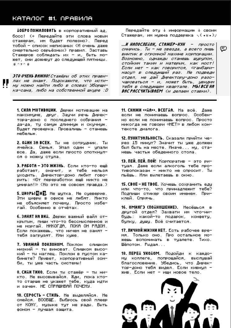 Главным элементом игры являются офисные правила - неписанные законы любого клерка, которые игрокам предстоит обнаружить самостоятельно.